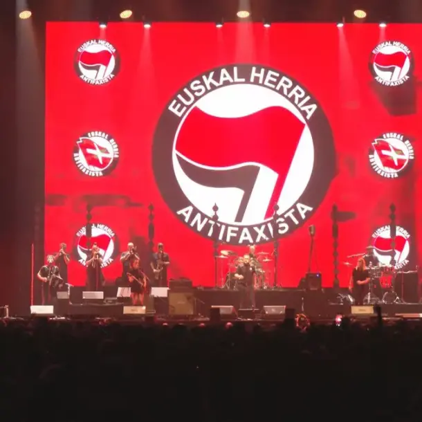 Garaiz zabaldu zituzten Nafarroa Arenako ateak. Palestinaren aldeko elkartasun manifestaziotik iritsi ziren asko, tartean Fermin Muguruza eta bere taldea, eta jendea gutxika-gutxika sartu zen eremura. Sartu orduko lehen irrintzia entzun genuen; txalo zaparrada atzetik. Pantailetan 40’ minutu rocken mezua: «Barrako etekin guztiak Etxera eta Harrera Elkarteei bideratuko zaizkie, egin topa haien alde!». Gernika Palestina elkartearen bandera palestinar erraldoia oholtzatik gertu eskegita zegoen. Gainerakoan, Anoetan baino aldarrikapen pankarta gutxiago; «Gora borroka antirrazista», «Euskal Herriak burujabetza, eskubideak denontzat» edota «Askatzera lotuak, 1975-2025» kartelak ziren ikusten ziren bakanak.