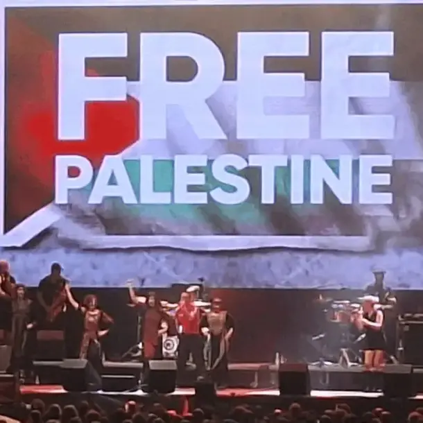 En la gran pantalla trasera que cerraba todo el escenario se leía el logotipo de Muguruza FM 1984-2024. Una gran bandera de Palestina con detalle del cuadro ‘Guernica’ de Picasso colgaba del lateral derecho.