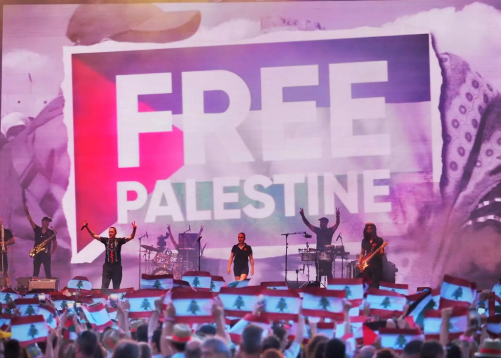 Como en el Sant Jordi, la amplia banda que le acompaña redimensiona un repertorio generoso, y con detalles como la trikitixa que marcó el inicio de La línea del frente, una de las imbatibles de Kortatu, y de las vividas más intensamente por el público que se citó en el escenario Estrella Damm. Muchos espectadores también mostraban unas pequeñas banderas palestinas de papel que el equipo de Muguruza había repartido por el recinto (y que llevaban la libanesa en el reverso). Cuando hacia el final tocaron Yalah, yalah, Ramala!, había un mar de banderas de Palestina en el Fórum. Antes de esta canción apoyó al grupo irlandés Kneecap y al dúo inglés Bob Vylan, investigados en Reino Unido para hacer proclamas a favor de Palestina y contra el ejército israelí en el Festival de Glastonbury. Un rato antes también hubo un llamamiento contra la especulación urbanística en Barcelona con una pancarta con el lema «Vallcarca para vivir, no para especular» llenando el escenario mientras interpretaban En la calle, otro incunable de Kortatu.